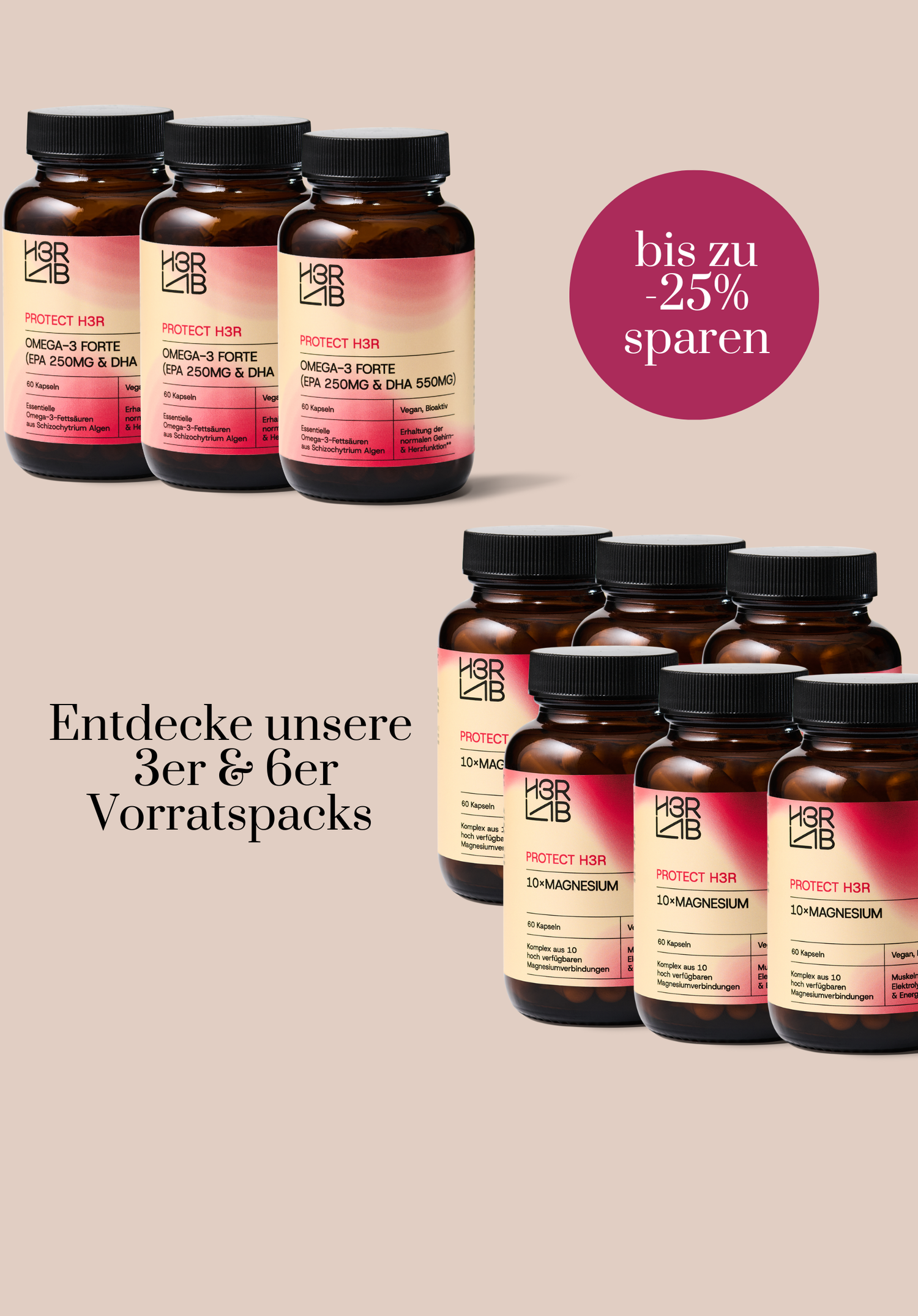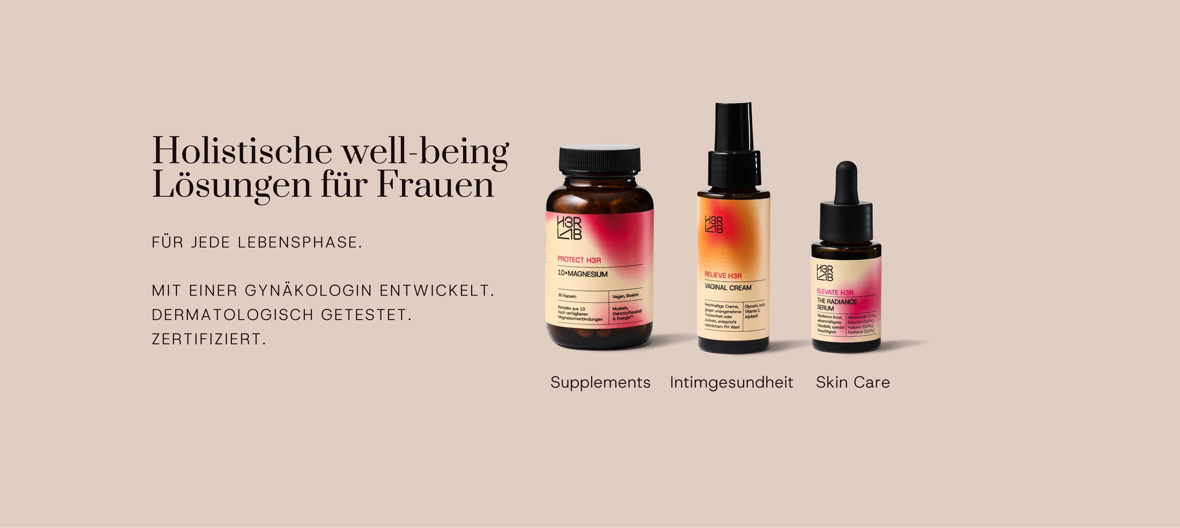 H3R LAB wurde speziell für die weibliche Gesundheit entwickelt – mit einem klaren Fokus auf hormonelle Balance, mentale Stärke und die besonderen Bedürfnisse in jeder Lebensphase. Unsere Rezepturen verbinden fundierte Mikronährstoffmedizin mit pflanzlicher Intelligenz – frei von künstlichen Zusätzen, 100 % vegan (bis auf wenige Produkte) und laborgeprüft.