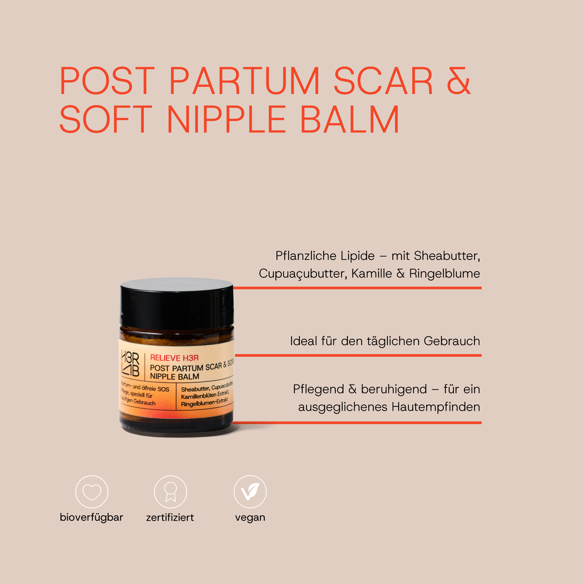 Der Nipple Balm wurde speziell für die besonders beanspruchte Haut im Brustbereich entwickelt. Eine reichhaltige Kombination aus Sheabutter, Cupuaçubutter und pflanzlichen Extrakten aus Kamille und Ringelblume beruhigt gereizte Haut und fördert die Regeneration. Die parfum- und geschmacksfreie Formel eignet sich ideal für täglichen Gebrauch – sanft zur Haut, sicher für Mutter und Baby.