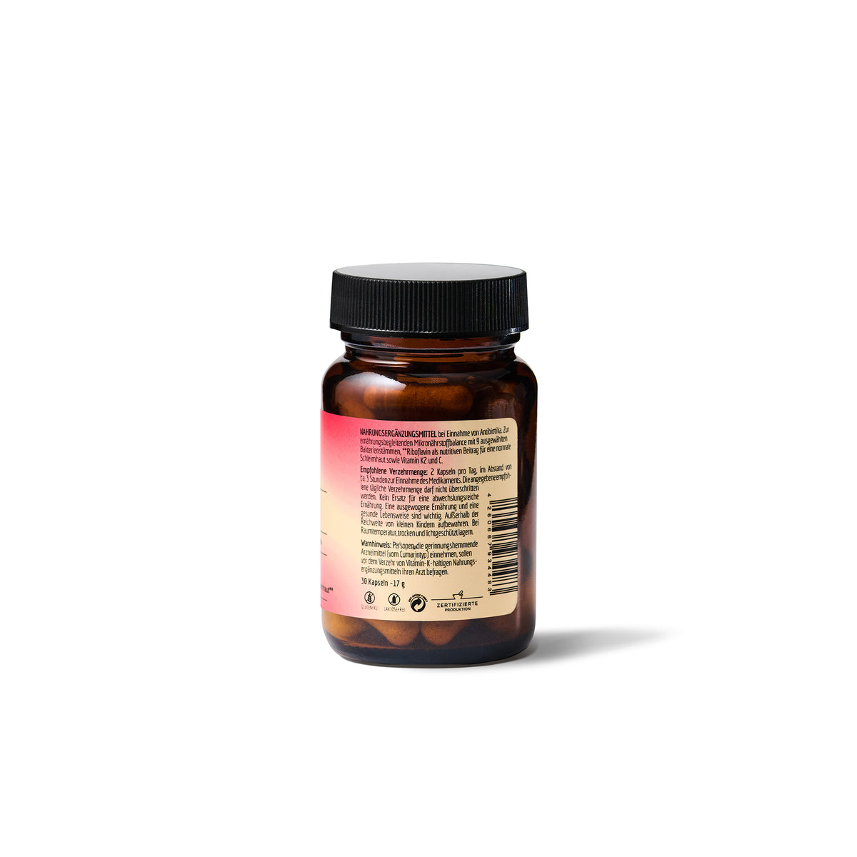 Die innovative Formel kombiniert neun wissenschaftlich dokumentierte Bakterienstämme mit gezielten Mikronährstoffen – für Diversität, Stabilität und Balance im Mikrobiom. Ergänzt wird sie durch Vitamin C, K2 und Riboflavin, die das Immunsystem stärken, die Knochenfunktion unterstützen und die Schleimhautgesundheit fördern – besonders im sensiblen Magen-Darm-Trakt.