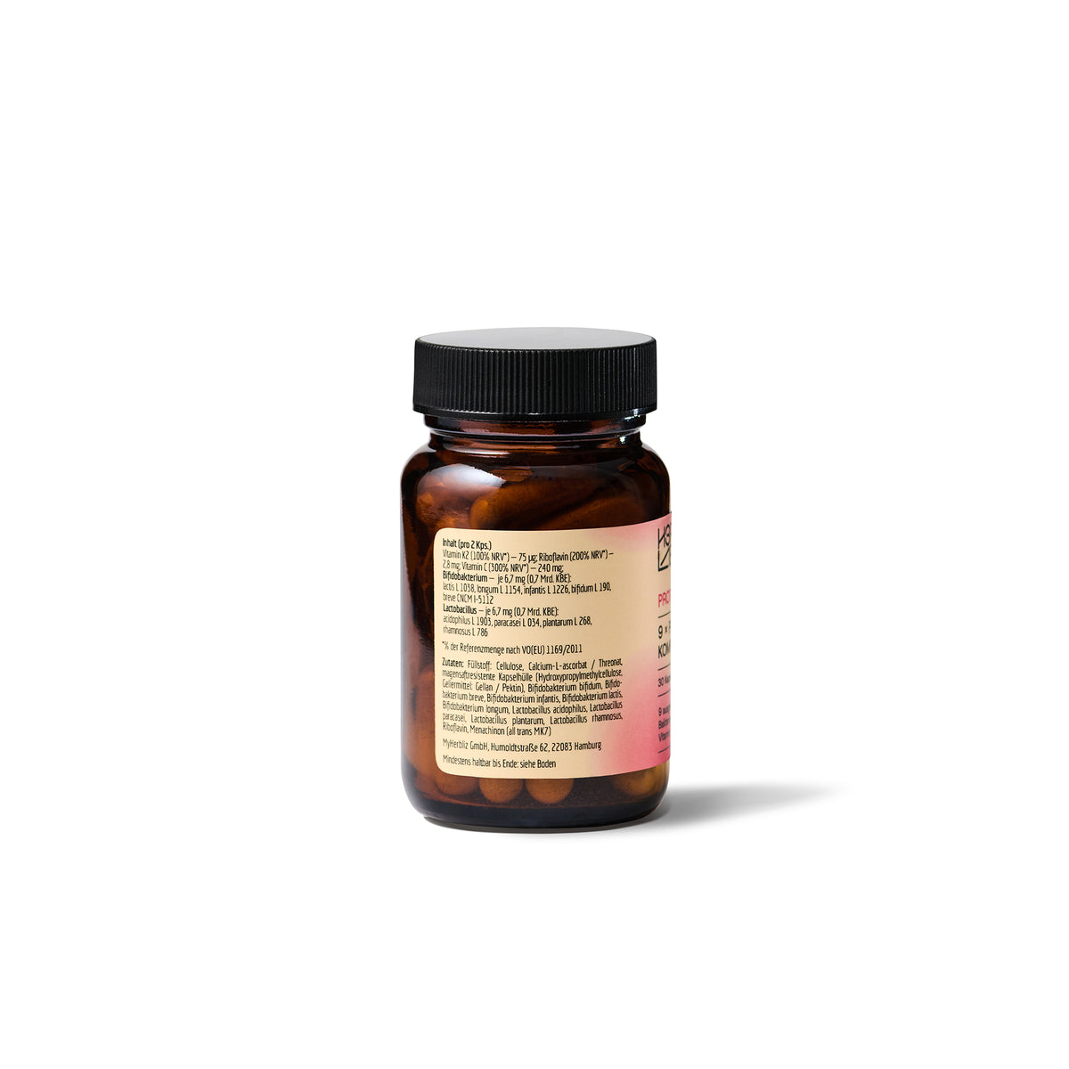 Füllstoff: Cellulose, Calcium-L-ascorbat / Threonat, magensaftresistente Kapselhülle (Hydroxypropylmethylcellulose, Geliermittel: Gellan / Pektin), Bifidobakterium bifidum, Bifidobakterium breve, Bifidobakterium infantis, Bifidobakterium lactis, Bifidobakterium longum, Lactobacillus acidophilus, Lactobacillus paracasei, Lactobacillus plantarum, Lactobacillus rhamnosus, Riboflavin, Menachinon (all trans MK7).