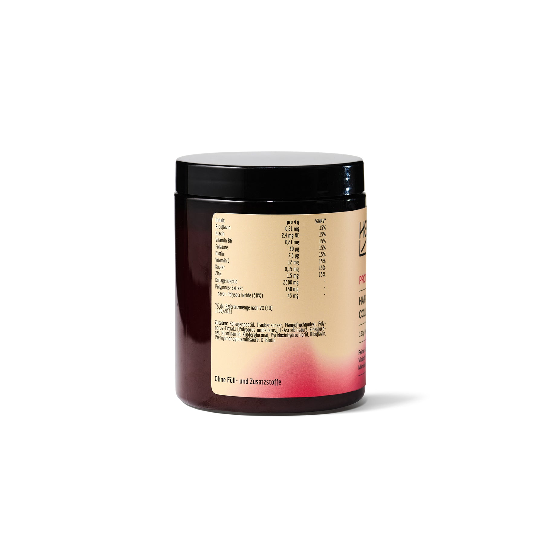 Hair & Skin Kollagen Komplex kombiniert bioaktive Kollagenpeptide mit sorgfältig ausgewählten Vitaminen und Mineralstoffen, die die natürliche Haut- und Haarfunktion unterstützen und Deine Zellgesundheit fördern.